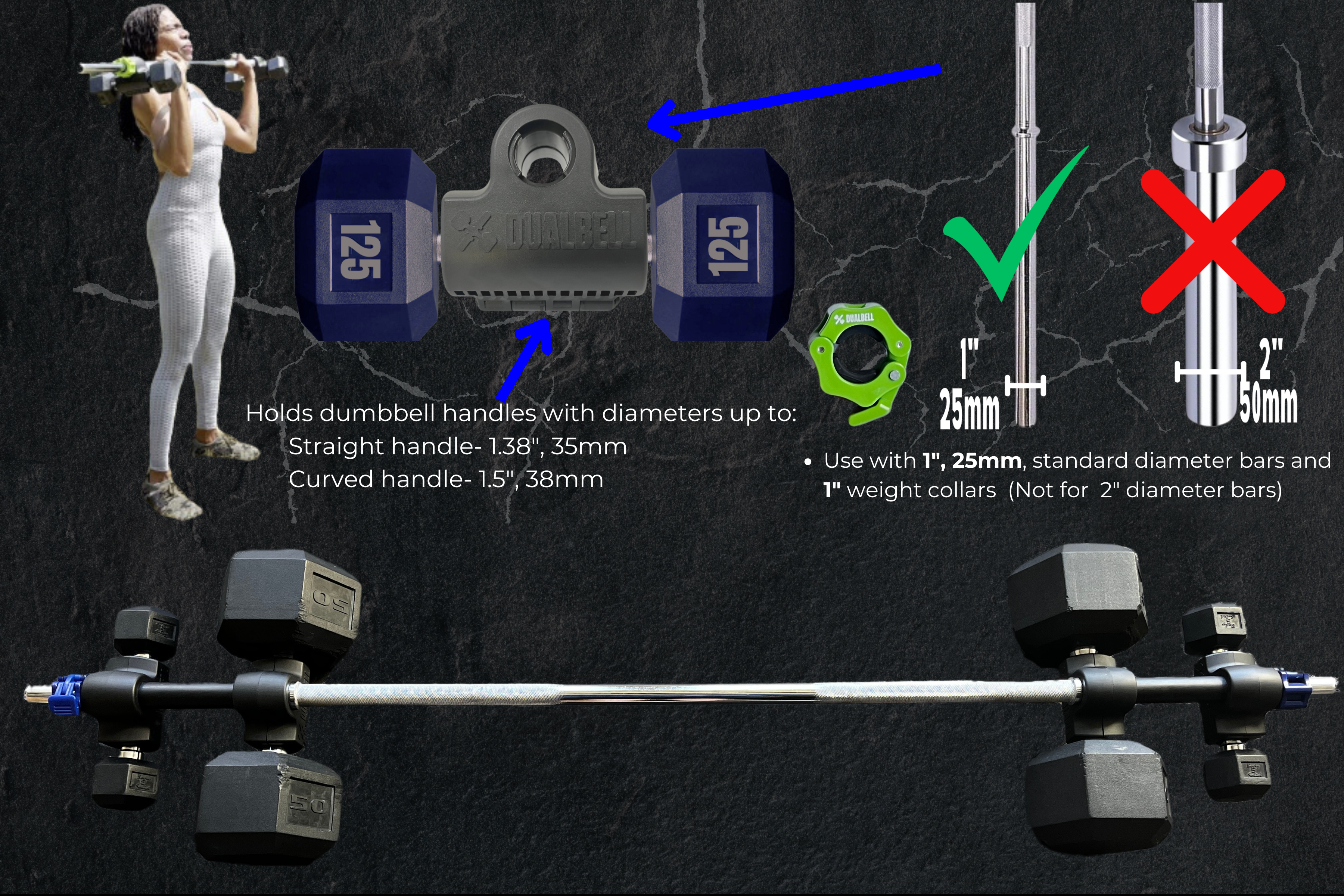 Simply clasp Dualbell around the handle of your dumbbells and slide it onto your bar for barbell exercises. When in use, the interlocking spacers provide stability for the option of adding a second set of dumbbells to the bar making it even easier for adding or removing weight. Plus, combining the weight of multiple dumbbells helps the user maximize weight gains.