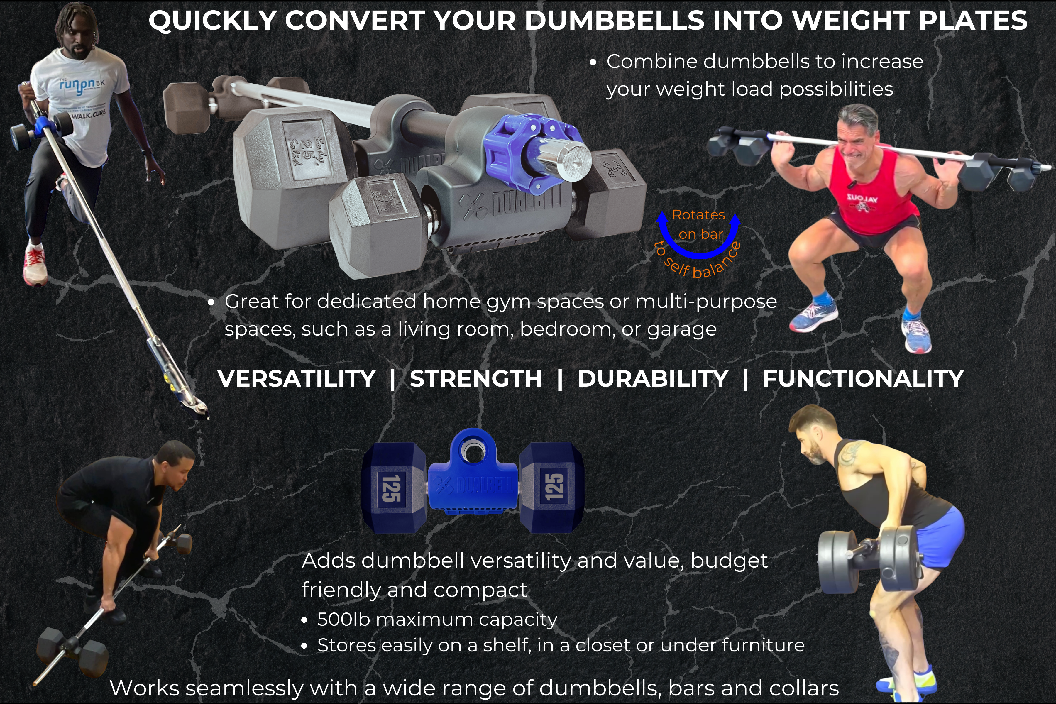 From deadlifts and squats to presses and rows, Dualbell provides the freedom to do barbell and dumbbell exercises with one compact system. Less clean up time, more lifting time. Making multipurpose dumbbells out of standard dumbbells, Dualbell isn’t just another piece of equipment—Dualbell is a game-changer that helps you maximize every workout without taking up extra space.