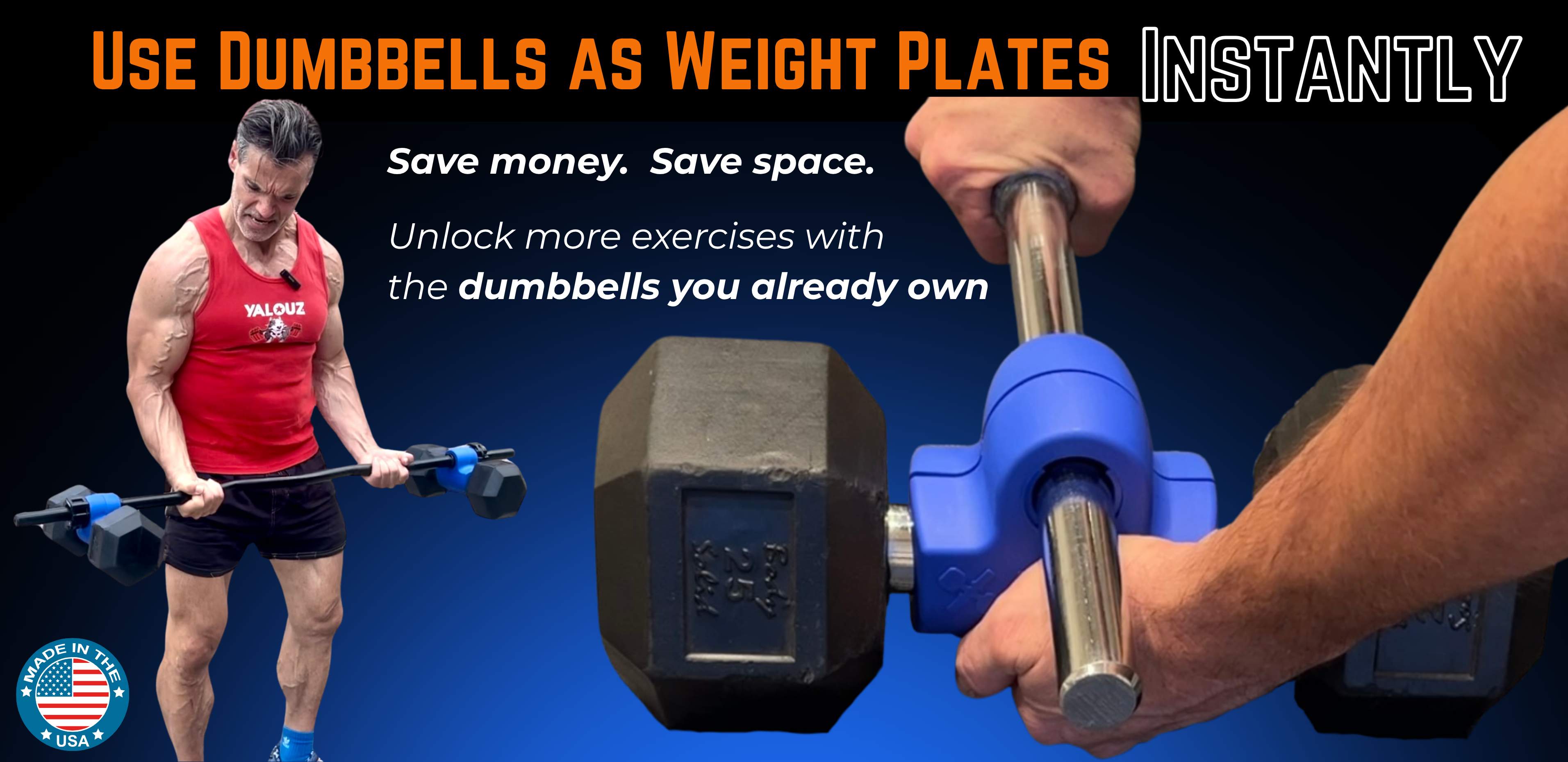 From deadlifts and squats to presses and rows, Dualbell provides the freedom to do barbell and dumbbell exercises with one compact system. Less clean up time, more lifting time. Making multipurpose dumbbells out of standard dumbbells, Dualbell isn’t just another piece of equipment—Dualbell is a game-changer that helps you maximize every workout without taking up extra space.